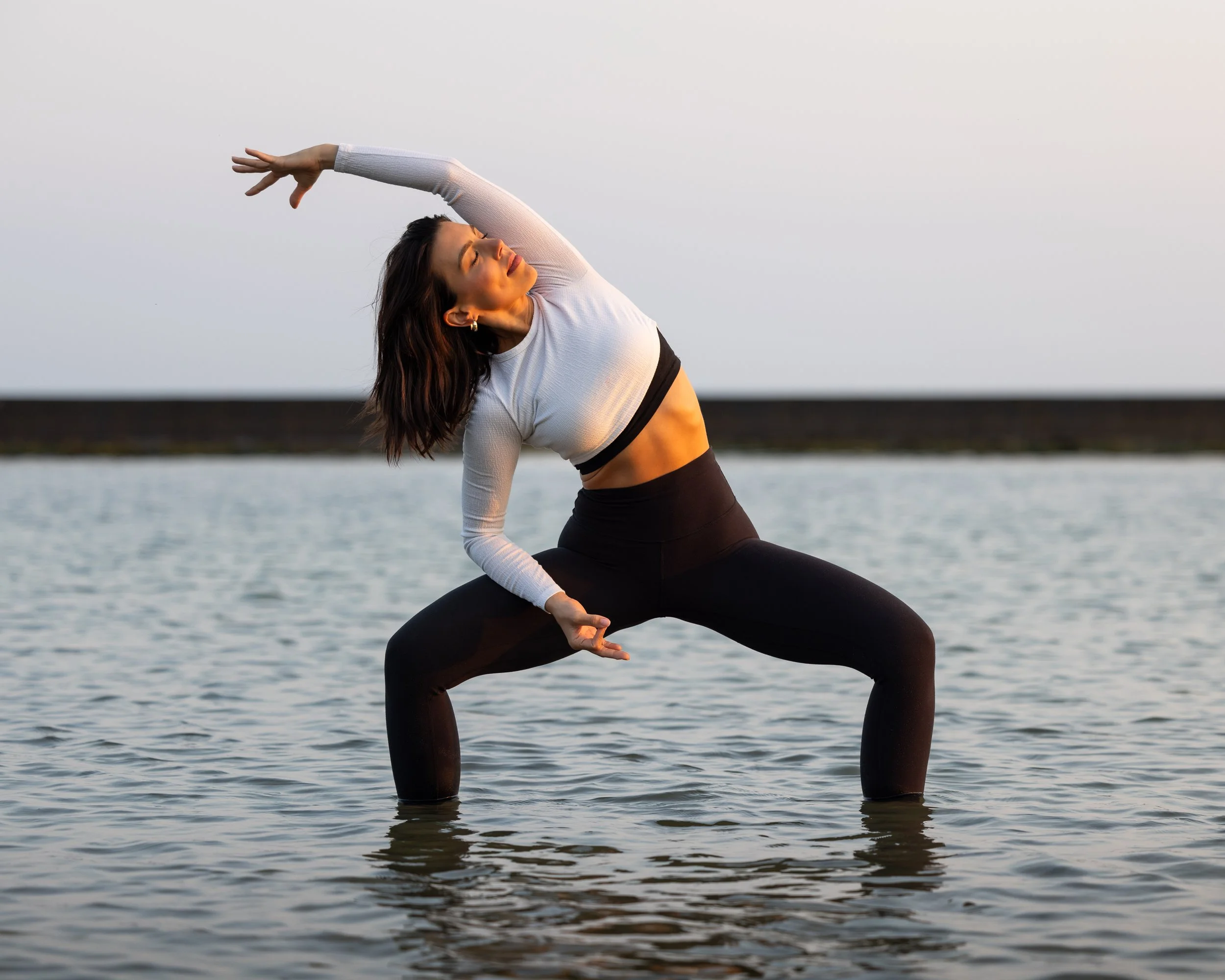 Woman practicing yoga outdoors in shallow water, performing a side stretch pose with one arm extended overhead and the other hand near her ankle.